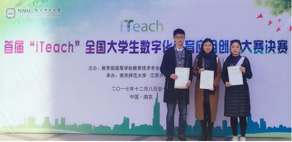 From December 8, 2017 to December 10, the first "iTeach" National Undergraduate Digital Education Application Innovation Contest was held in Nanjing Normal University and Jiangsu Open University. Our faculty and students actively participated in the contest and excelled in the final with outstanding performance. Both two teams won the first prize.