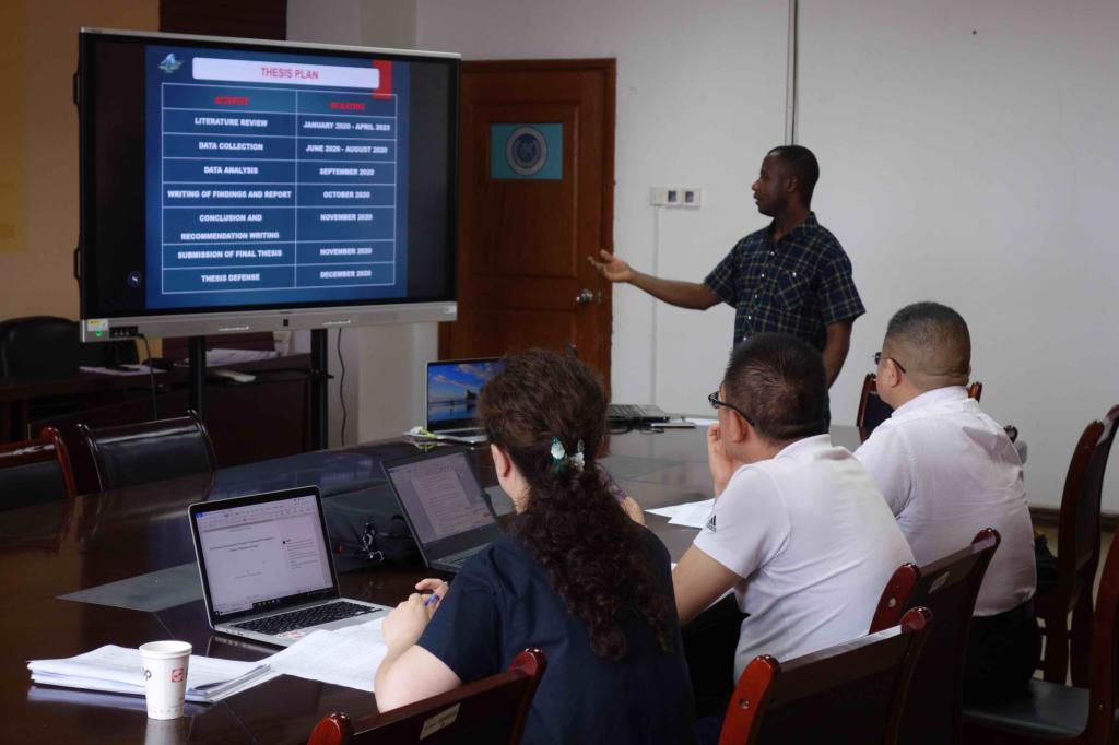 Irina Vlasenko and Anthony Sylvester Anning first made a PPT statement. The experts then asked questions about the research theme, research method, and scientific nature of quantitative tools. The two students carefully listened the questions raised by the experts and answered them one by one. Flavian Adhiambo Odhiambo and Jenifa Joseph Mapunda are currently in Kenya and Tanzania, respectively. Due to the epidemic, they were unable to return to school to participate in the opening of the topic. The experts at the meeting commented on the relevant content of the opening report with the two students through internet.