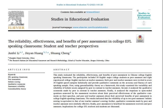 Recently, Professor Huang Jinyan, the director of the Evidence-based Research Center of Education Evaluation, doctoral supervisor and postdoctoral co-supervisor of Jiangsu University, has achieved a series of academic research achievements.