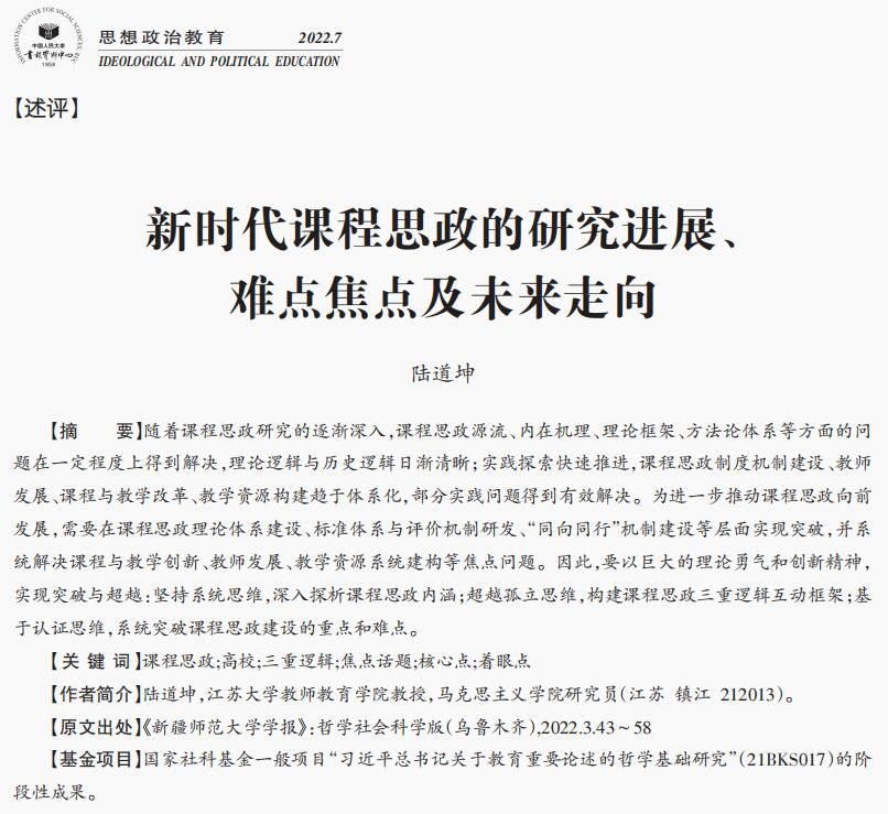 陆道坤. 新时代课程思政的研究进展、难点、焦点及未来走向