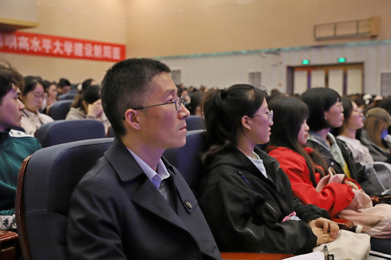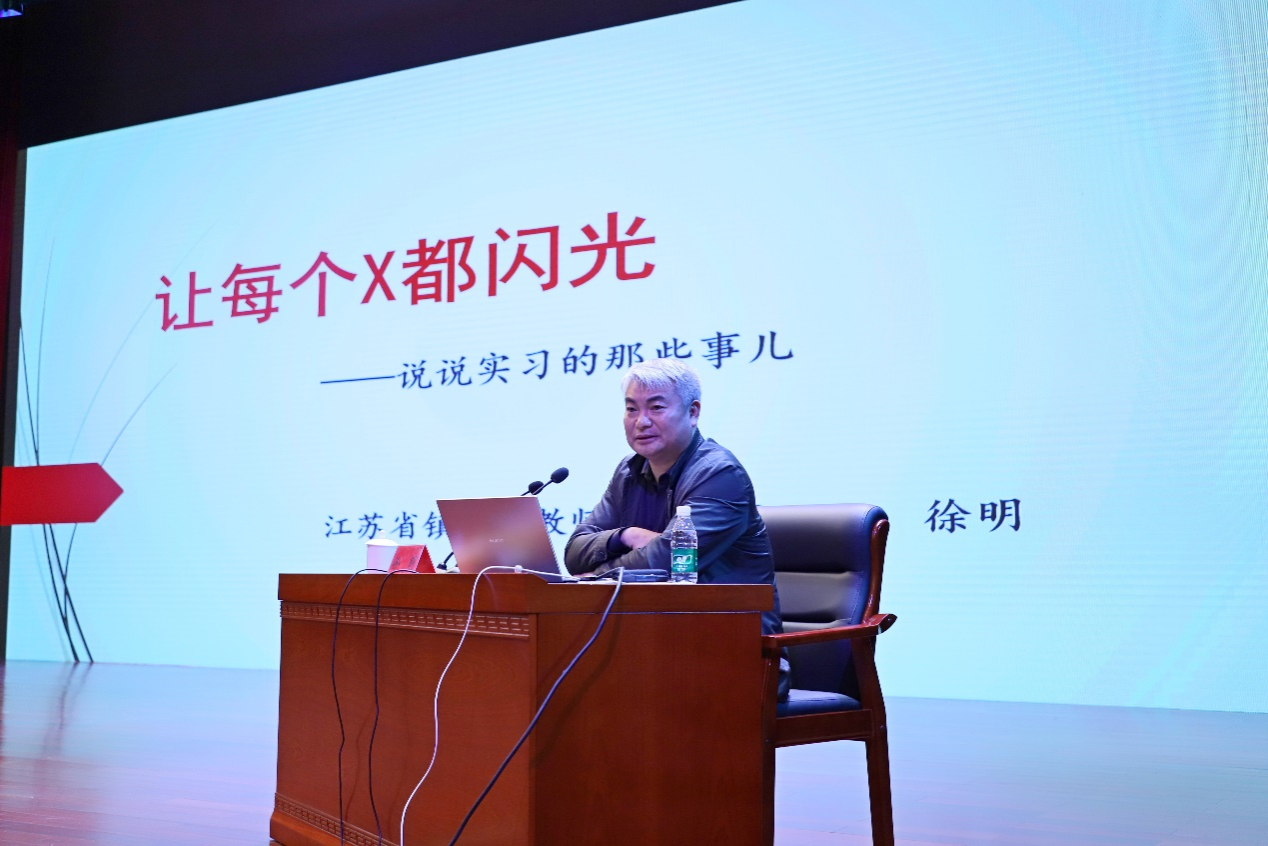 在大会第二阶段,江苏省特级教师徐明作题为《让每个X都闪光——说说实习那些事儿》的讲座。徐老师从装好初始系统、链接趋势端口、掌握基本操作、点亮关键窗口和丰富自我内存五个方面展开交流,现场邀请多位学生互动,为师范生点亮思维火花,生动诠释了“教育不是灌输,而是点燃火焰”的教育理念。