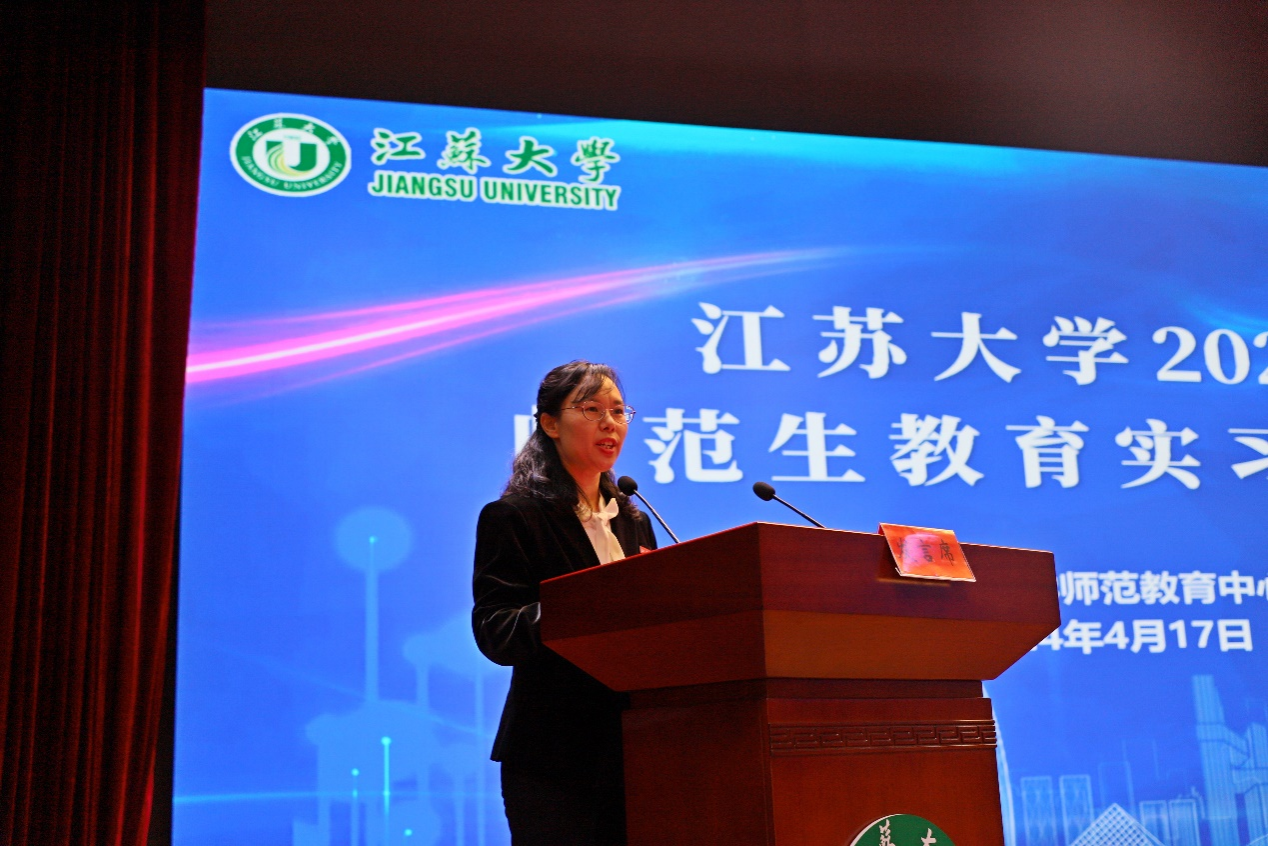 镇江第三中学副校长傅文霞作为教育实习基地代表发言。镇江三中为每一位实习生选聘师德高尚、以身作则、教学水平高、教学效果好的骨干教师作为教学工作导师;选聘深受学生喜爱、班级管理水平高的优秀班主任作为实习生的班主任工作导师;定期组织实习生参加校内教学研讨会。