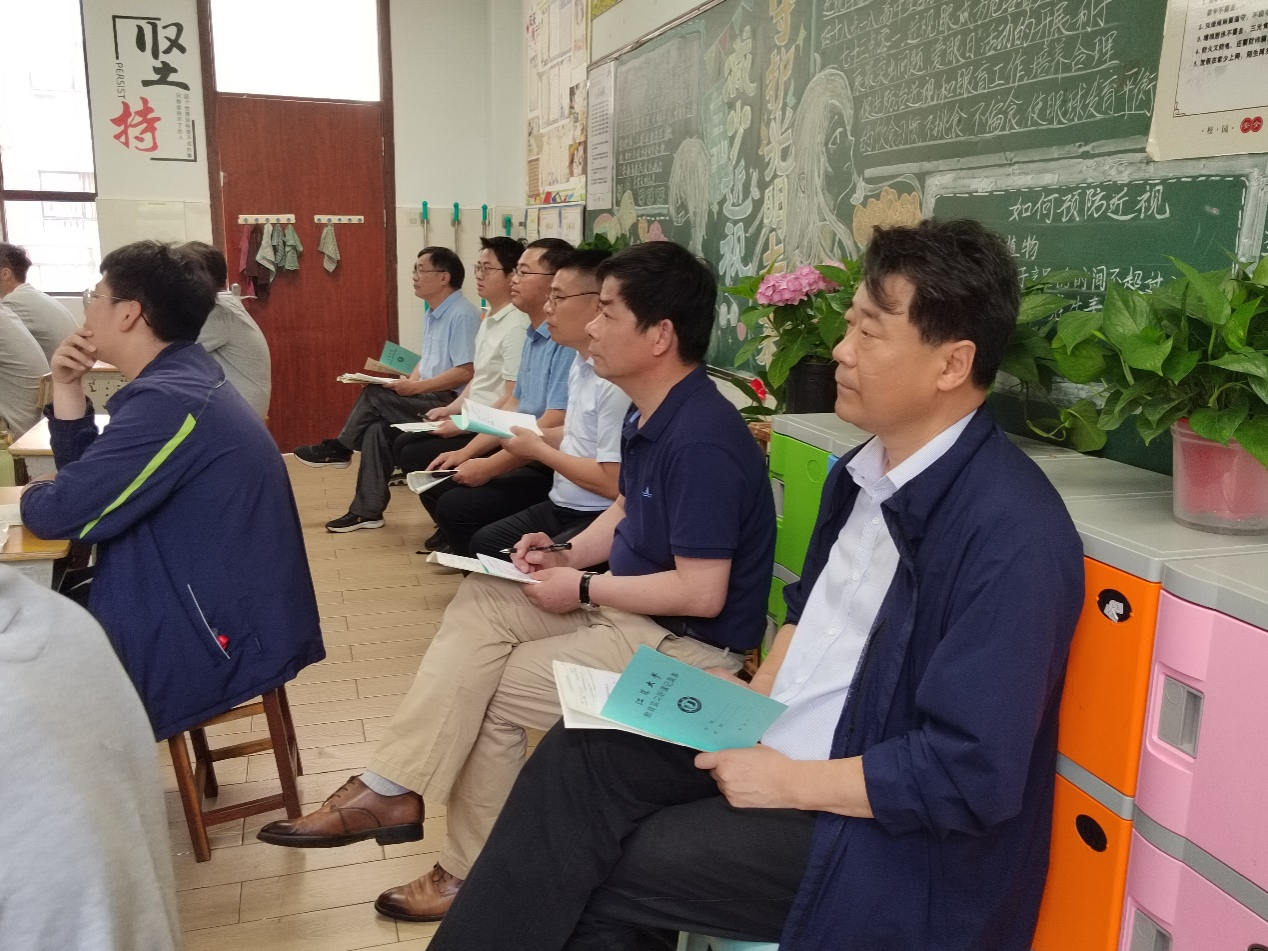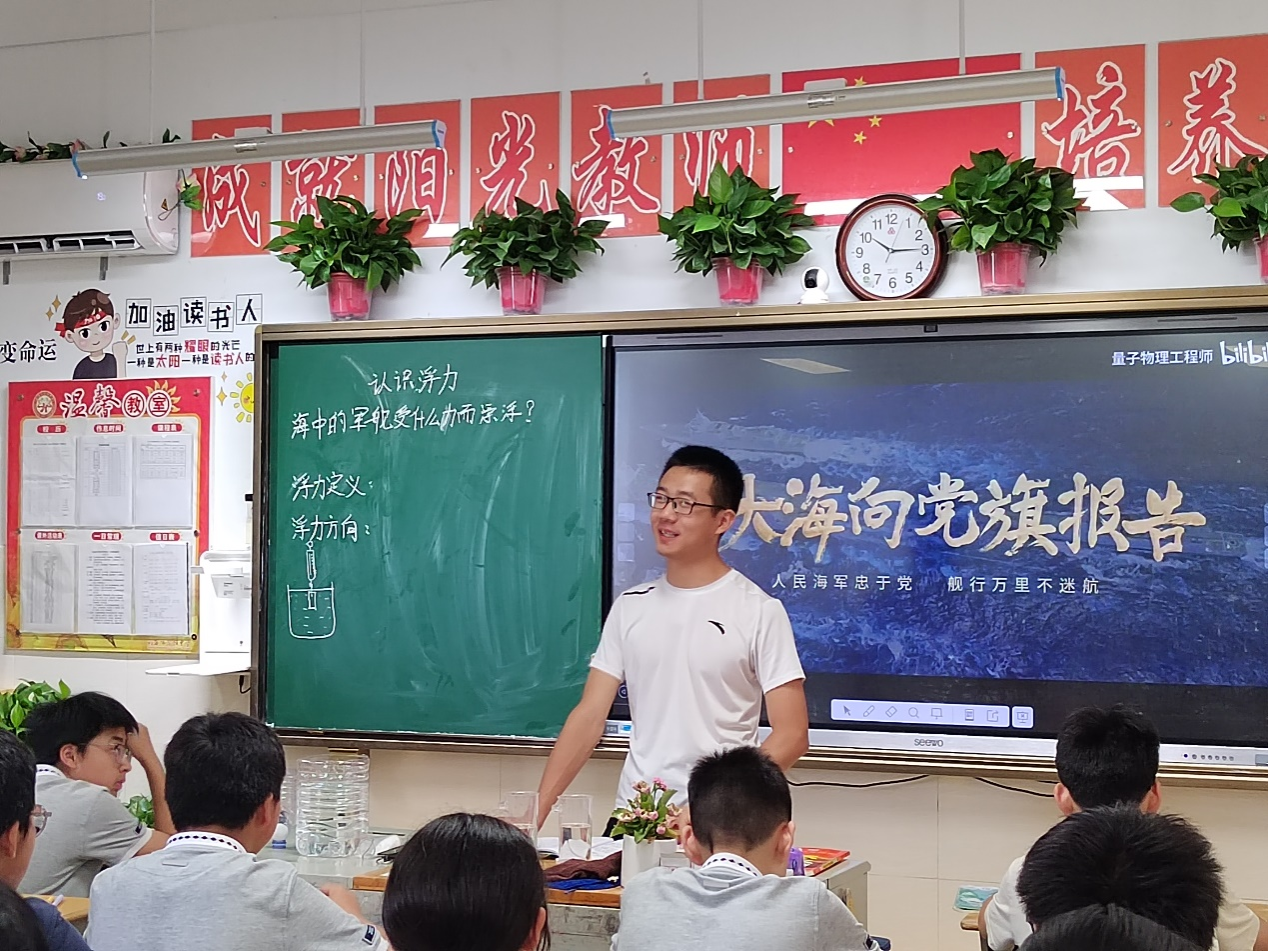 句容市华阳中学副校长杨树兵带领花都影视 调研团老师参观校园,并一起走进八(1)班听评课,观摩物理学(师范)专业实习生柯更晰的讲课。