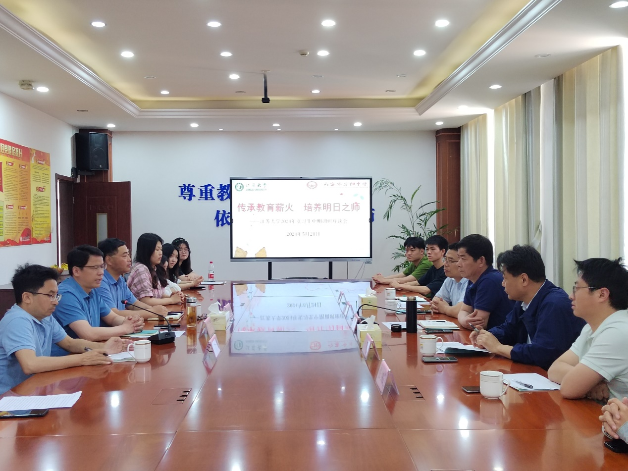 句容市实验高级中学党委书记汪涛、校长薛国强、副校长曾玮、指导教师代表和全体实习生参加调研座谈会。实习生分享了实习期间与高中生同步作息对体能的挑战,上课后获得学生好评的成就感,实习过程累并快乐着。蒋俊明代表花都影视 感谢句容市实验高中给予实习生锻炼成长的机会,看到同学们的成长变化,鼓励同学们要拿出百分百的诚意,跟中学指导老师习得真本领,扎实基本功。座谈会后,双方就加强师范专业建设、师范生就业等方面进行了研讨。