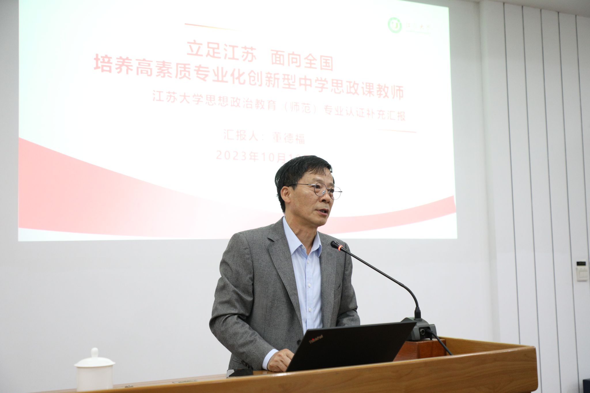 思想政治教育(师范)专业负责人董德福教授对专业自评情况作补充说明。在说明中,他介绍了专业认证的前期准备工作,并从专业发展新平台角度,对思想政治教育(师范)专业发展历程、平台建设、组织架构、育人环境等做了介绍;从人才培养新成就维度,对思想政治教育(师范)专业的培养方案完善、课程体系改革、教学质量保障、学生实践创新等成果作了汇报;从瞄准未来新目标层面,对未来专业建设的规划思路、目标、方向等做出展望。